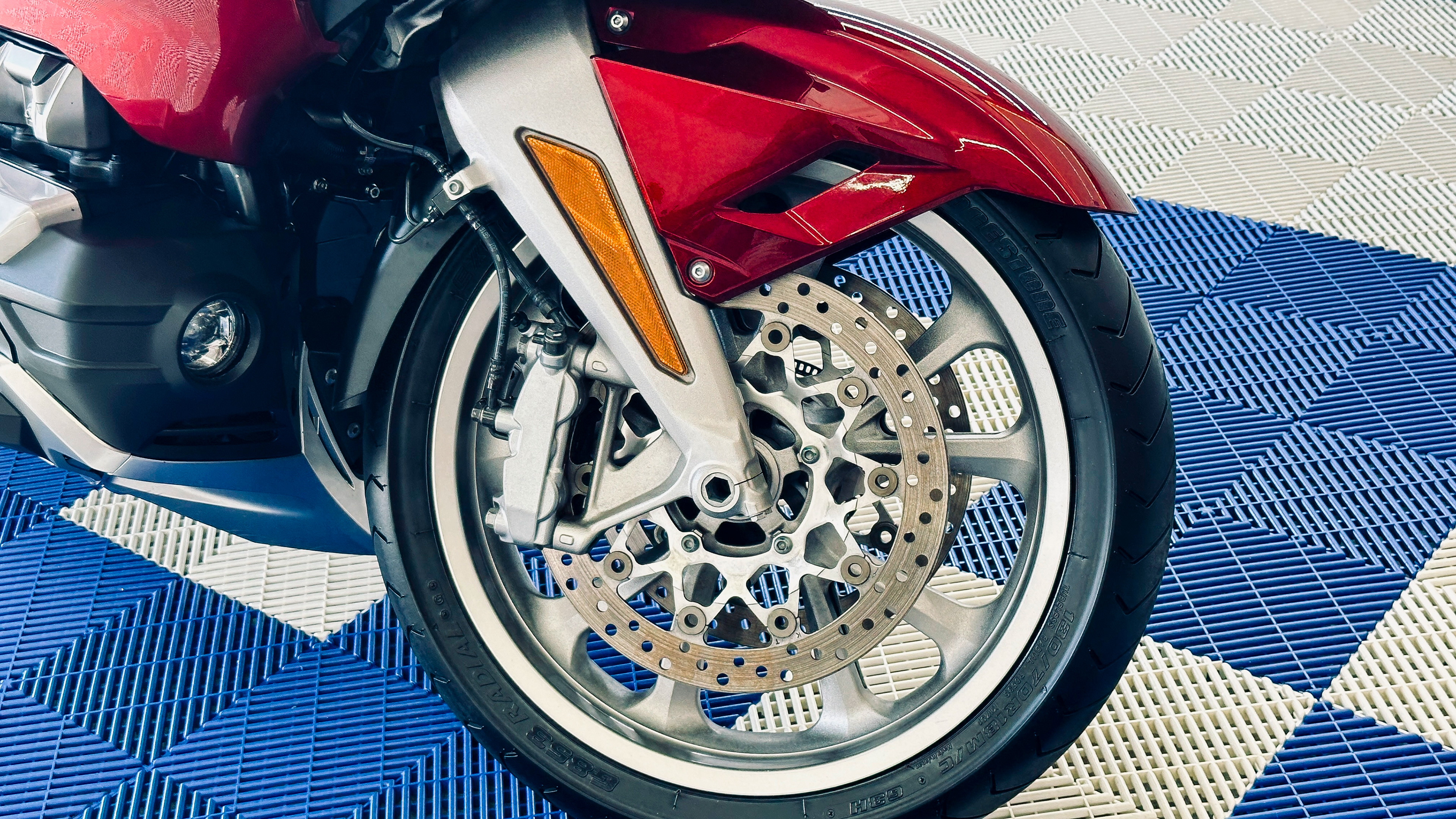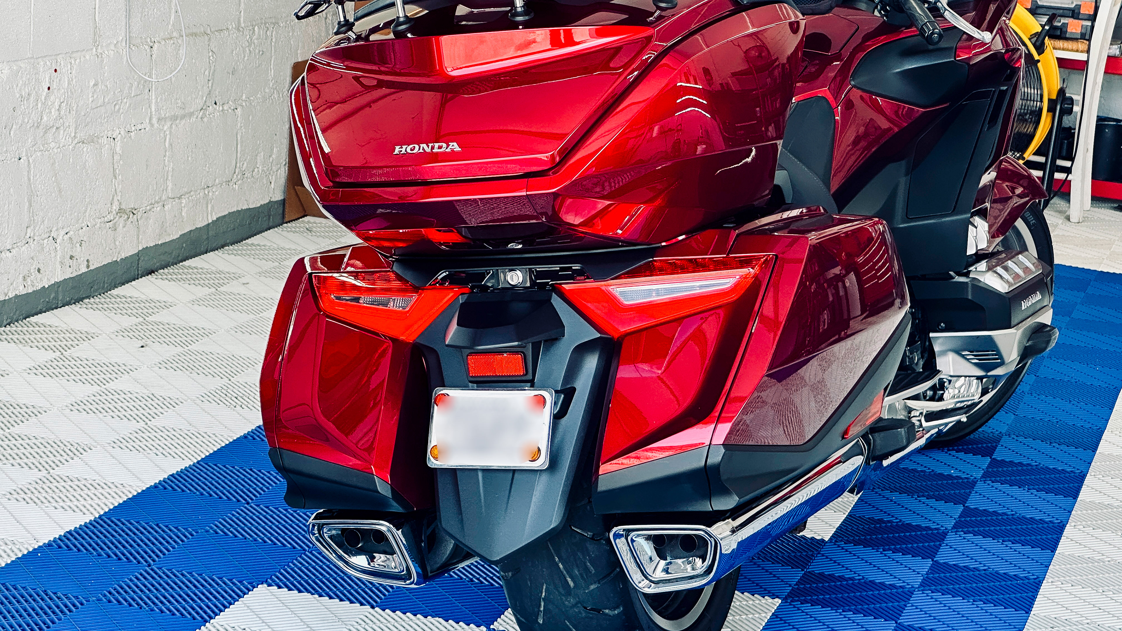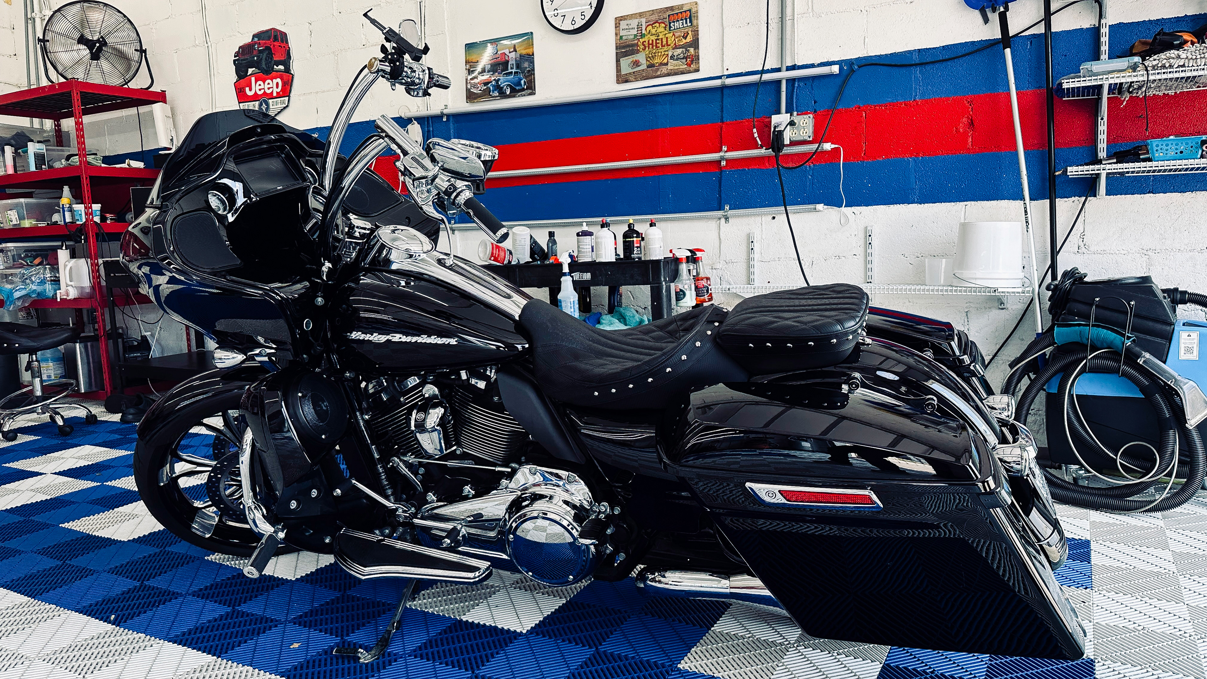 Touring bikes have vast surface areas. We perform a machine polish on all painted panels to remove swirl marks and fine scratches. This restores the "wet look" to the finish, ensuring the metallic flake catches the light from every angle.