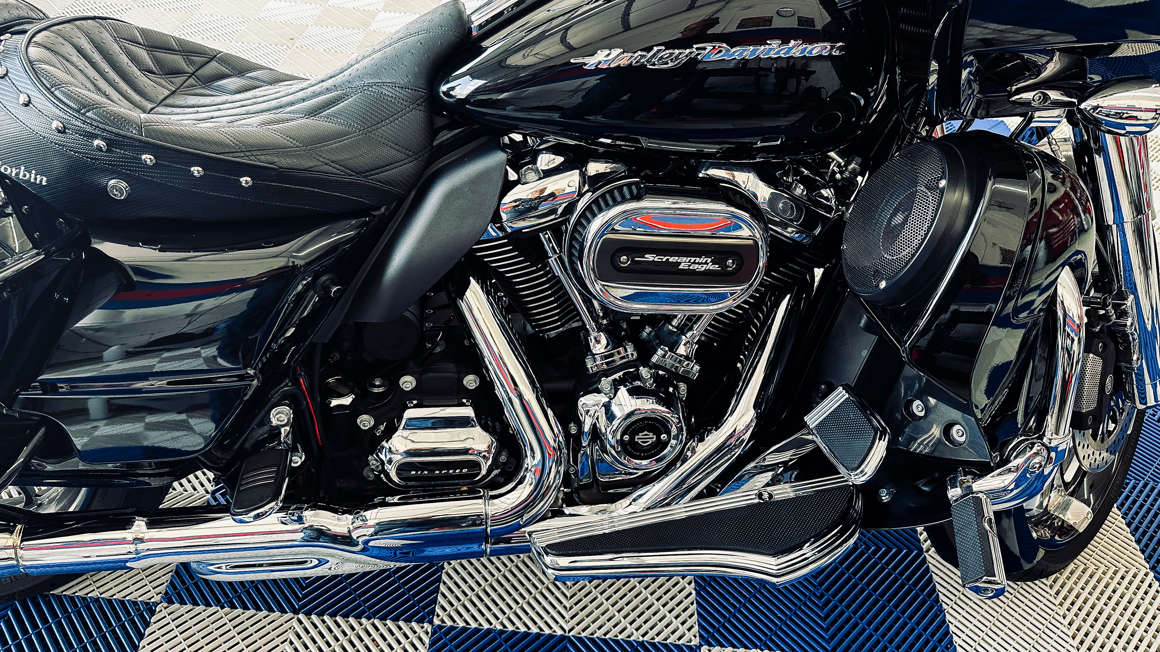 The true detail is in the shadows. We hand-clean the shaft drive, exhaust headers, and every spoke. The dash and navigation screen are treated with anti-static, streak-free cleaners, while the leather seating is conditioned to remain supple and UV-protected.